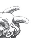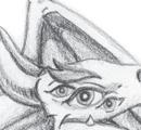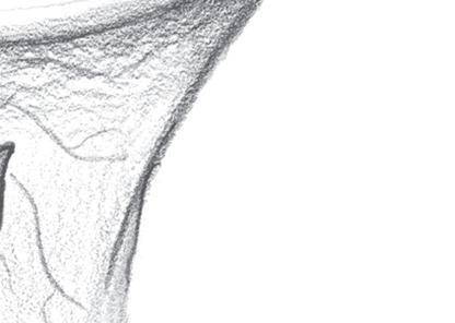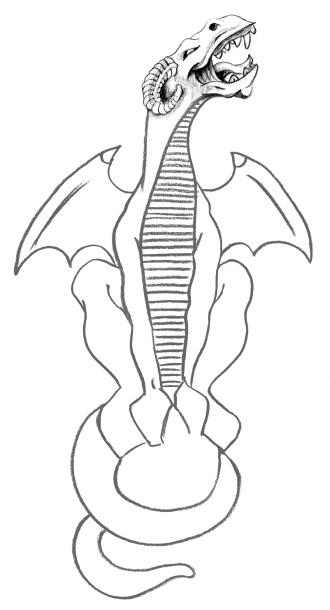 3 Dibujo el contorno de las alas en torno a los huesos. Después, refino el rostro. Remato la nariz y la boca, para lo cual añado la lengua enroscada y unos dientes afilados. A continuación, dibujo un arco sobre la nariz e incorporo una narina. También añado el cuerno curvo bajo el ojo.