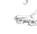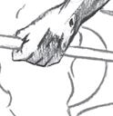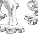 7 Sombreo alrededor de las líneas del cuello y del vientre. A fin de crear una textura oscura y estriada, le añado tono a las patas; además, repito esta textura en zonas de la piel. Hago que las patas traseras tengan un aspecto nudoso y que estén dobladas. Después, le aplico tono a la cola, donde dibujo unas rugosidades más claras y sueltas.
