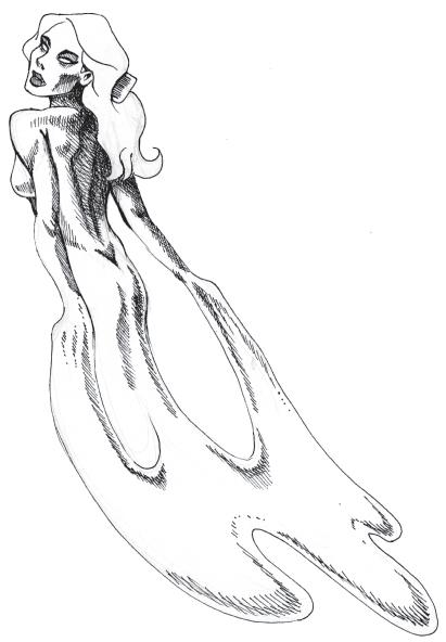 6 Uso un estilógrafo de 0,5 mm con tinta resistente al agua para intensificar los contornos de los brazos y de la tela. Dibujo también unas onduladas líneas por el cabello; al hacerlo, procuro que sean sencillas para, así, evitar que la cabeza tenga un protagonismo excesivo. Como toque final, extiendo la cadera izquierda de la banshee para que pueda verse detrás del brazo izquierdo, ya que así se obtiene una representación más equilibrada y verosímil.