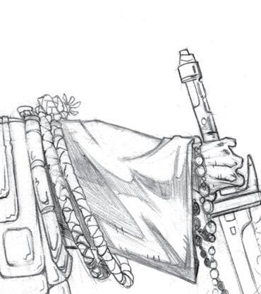 3 Defino aún más la musculatura y uso el lateral del 2H para esbozar algunas ideas para la ropa. Observe las elipses que forma el cinturón que lleva ceñido a la cintura y las correas que lleva en los muslos. También experimento con las expresiones faciales y desarrollo la espada de la derecha.