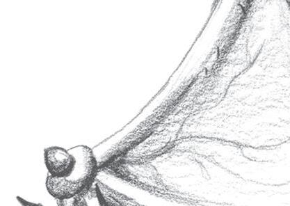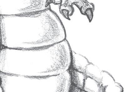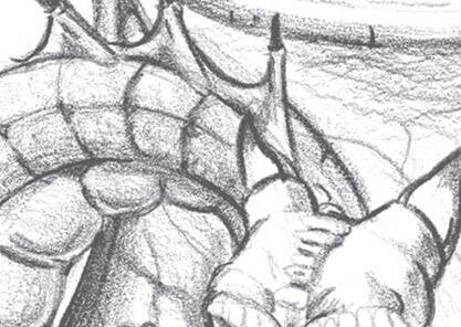 6 Sin dejar de usar el 2B, dibujo y después sombreo en torno a las rugosidades de las alas para, así, transmitir sensación de profundidad. A continuación, sombreo las patas delanteras, a cuyos codos les incorporo unos afilados pinchos que replican la figura de las alas. También oscurezco las garras.