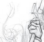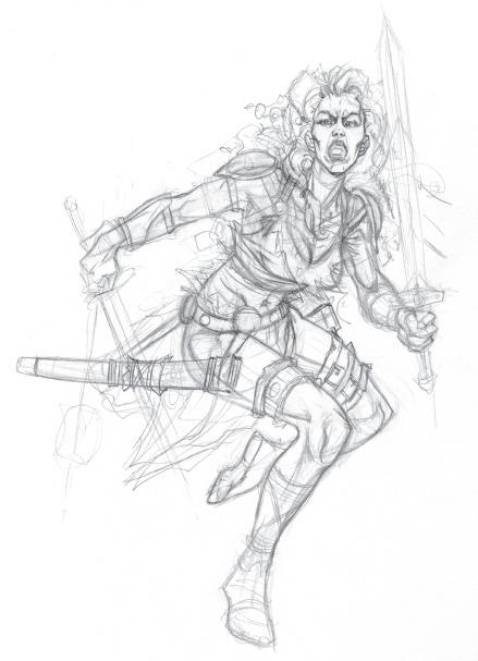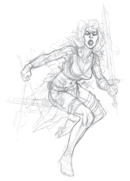 1 Aunque me gusta la postura de ataque de mis bocetos conceptuales, decido que el personaje sea femenino (no como en la miniatura). Al esbozar la postura con el lateral de un lápiz 2H, tengo en cuenta las peculiaridades anatómicas: caderas más anchas e inclinadas hacia delante, hombros más estrechos y piernas más femeninas. Después, sin dejar de recurrir al lateral del 2H, dibujo las formas básicas y los principales puntos anatómicos. Desarrollo las espadas y un poco del cabello; además, comienzo a experimentar con la ropa.