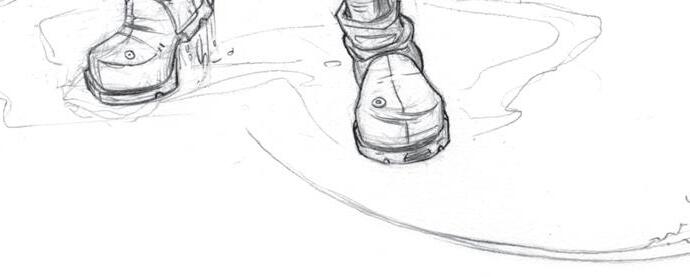 6 A continuación, paso por el resto del personaje para añadirle sombras y refinar la anatomía visible. Para las zonas de metal, uso el lateral del 2H, con el que realizo trazos de gran contraste; después, vuelvo al 2B para intensificar los bordes y, así, lograr un aspecto metálico. Al añadirle arrugas a la ropa, me aseguro de ceñirme a las formas que tienen debajo.