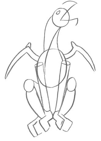 2 Sin cambiar de lápiz, dibujo más figuras básicas para seguir desarrollando el cuerpo. Agrego los huesos de las alas, los cuales tienen forma de hoz. Después, incorporo unos pies cuadrados así como las cilíndricas patas delanteras. Dibujo un ojo pequeño y sigo desarrollando las líneas guía para hacer la boca.