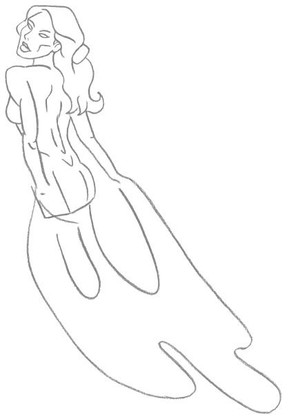 2 Empleando las figuras básicas, comienzo a refinar el cuerpo. Agrego unas líneas curvas a la alargada y esbelta espalda para representar la musculatura. A continuación, dibujo el ondulado cabello y le incorporo un peine. También añado la oreja y una línea para representar el pómulo. Llegado a este punto, borro la mayor parte de mis líneas de construcción.