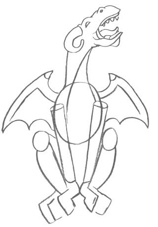 1 Uso un lápiz 2H para esbozar las figuras básicas de las que se compone este dragón de tormenta. Comienzo con un círculo para la cabeza, un óvalo para el cuerpo y dos círculos para las rodillas. A continuación, añado el robusto cuello y la parte inferior de las patas traseras. Sugiero la boca con dos líneas que salen de la cabeza.