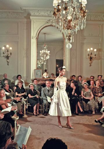 Las colecciones de Dior, como se aprecia en esta imagen de 1950, se presentaban en el elegante salón pintado de gris de su taller, en el número 30 de la avenida Montaigne, que siempre se llenaba.