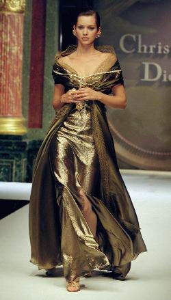 Igual que a Dior, a Ferré le encantaba el glamur, que encarnó en este largo vestido dorado confeccionado con terciopelo de pana con una capa de tafetán de seda de la colección de alta costura otoño/ invierno 1993/1994.