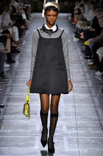 Miuccia Prada siempre pone frente a frente lo elegante y lo extravagante, y la emblemática singularidad de su estética se encuentra, sin lugar a dudas, a la vanguardia de la evolución del gusto. Una vez que la copian, la diseñadora pasa a ofrecer otra desconcertante visión de referencia. Su colección prêt-à-porter primavera-verano 2019 se presentó en el cavernoso espacio multiusos de la Fondazione, Milán, inaugurado por Prada en 2015. Apelando directamente a la juventud, la diseñadora se valió de minipichis, túnicas de satén duquesa con línea en A, calcetines hasta la rodilla y jerséis de cachemira con recatados cuellos blancos para evocar a la jeune fille de la década de 1960 Los estampados de Prada llevan todos los sellos de la estética Prada, con patrones textiles geométricos de inspiración retro que se superponen a las paletas cromáticas incongruentes de la firma de la diseñadora, como el mostaza con marrón y morado. Por el contrario, lo que destaca de este pichi negro recortado es su sencillez monocromática. MF