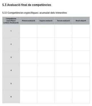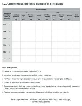 Avaluació per competències específiques amb una proposta de distribució de percentatges.