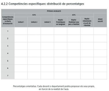 Avaluació per competències específiques amb una proposta de distribució de percentatges.