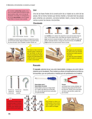 Unir Una de las fases finales de la construcción de un objeto es la unión de las piezas. De la misma manera que hemos medido y marcado bien las piezas para cortarlas con precisión, conviene también medir y marcar bien dónde vamos a poner los clavos o los tornillos.