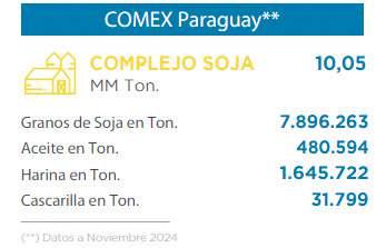 Otro de los puntos llamativos que se destaca en el boletín es que el ingreso de divisas generado por la venta al extranjero de soja y sus derivados industriales (aceite, harina y cascarilla) alcanzó US$ 4.125,40 millones, una retracción de 9% con respecto al acumulado a noviembre del 2023.