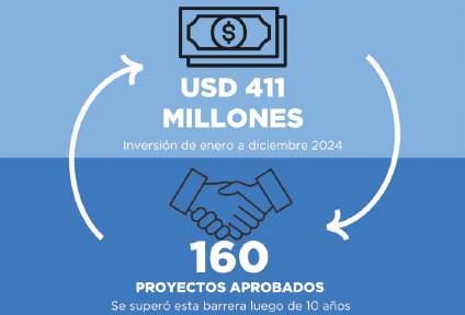 Del total de las inversiones proyectadas, US$ 261 millones provinieron de capital nacional, lo que representa un crecimiento del 24% con respecto al 2023. Por su parte, la inversión extranjera alcanzó los US$ 150 millones, incrementándose en un 35% comparado con el mismo año.