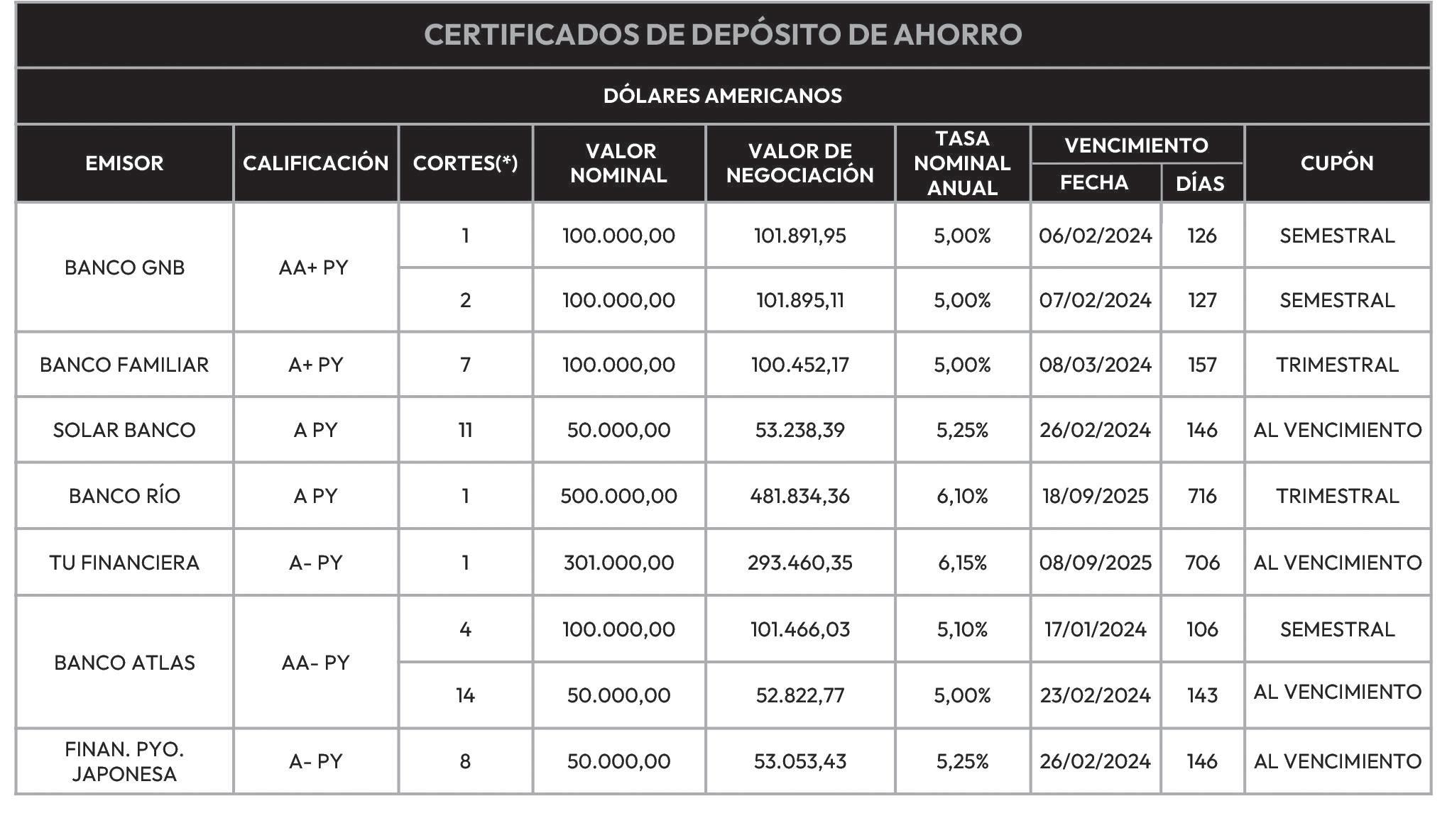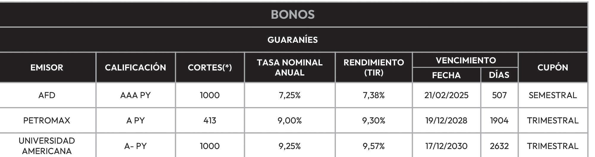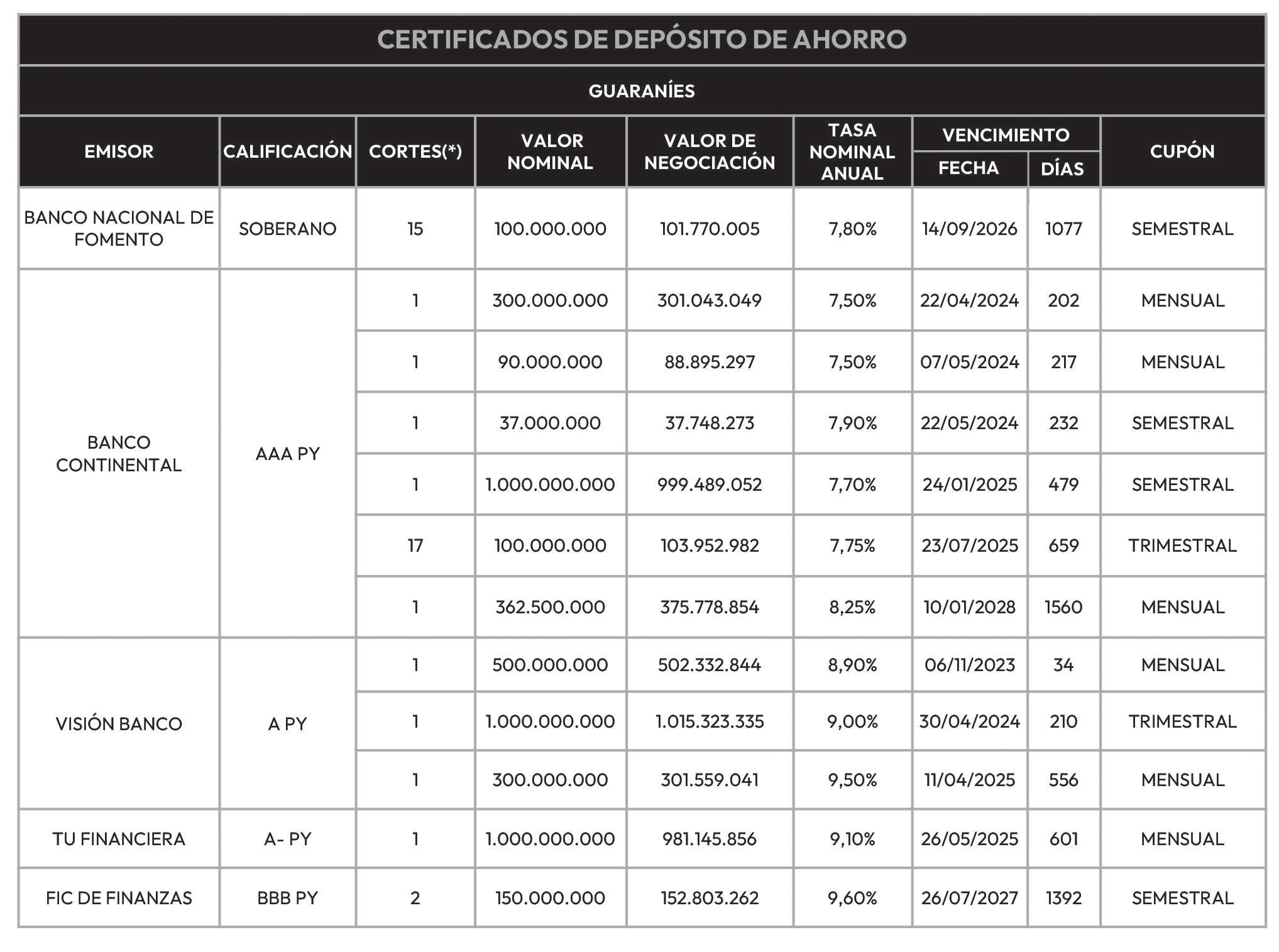 V: 1.460 Euro C: 8.080 - V: 8.400 Peso Chileno C: 5 - V: 10 Peso Uruguayo C: 150 - V:230 Libra Esterlina C: 7.500 - V: 9.500 A marzo 2023 - Cifras en millones de US$ Fuente:BCP.Datosenmillonesdedólares.Junio2023 18.299 15.051 5.709 0 5.000 10.000 15.000 20.000 Microsoft Google Meta 0 5.000 10.000 15.000 20.000 Microsoft Google Meta 1 220.000.000 247.664.009 9,00% 20/11/2023 91 Al Vto. 50.000,00 52.519,88 5,00% 23/02/2024 Finan. Pyo. A- PY 8 50.000,00 52.733,81 5,25% 26/02/2024 189 Al Vto. ¿ESTÁS PENSANDO EN INVERTIR? 23 ÍNDICE Martes, 22 de agosto de 2023 23 ÍNDICE 20.100 18.368 7.788 Miércoles, 4 de octubre de 2023