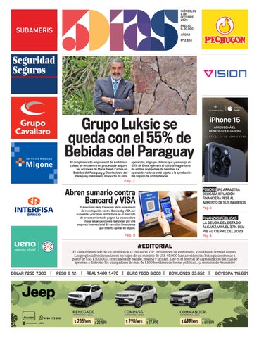 PESO 23 31 REAL 1.240 1.300 EURO 6.900 7.550 DOWJONES 32.396 BOVESPA 103.361 DÓLAR 6.830 6.890 | | | | | PESO 23 31 REAL 1.240 1.300 EURO 6.900 7.550 DOWJONES 32.396 BOVESPA 103.361 DÓLAR 6.830 6.890 | | | | | 17 25 REAL 1.400 1.480 EURO 7.450 7.850 DOWJONES 33.133 BOVESPA 112.223 7.300 7.430 LUNES 23 DE ENERO 2023 PRECIO G. 20.000 AÑO 11 N° 2.550 Pág. 7 TESORO PARAGUAY #EDITORIAL