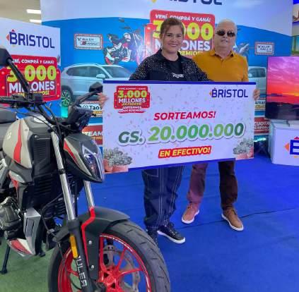 En su casa central, Bristol hizo entrega de una moto Buler Supersort más 20 millones en efectivo a la flamante ganadora. Se trata de Olga Senobia Dimitropulos de Avalos de la ciudad de Coronel Oviedo, quien con la compra de una afeitadora y un cepillo secador resultó la ganadora en el sorteo de agosto.