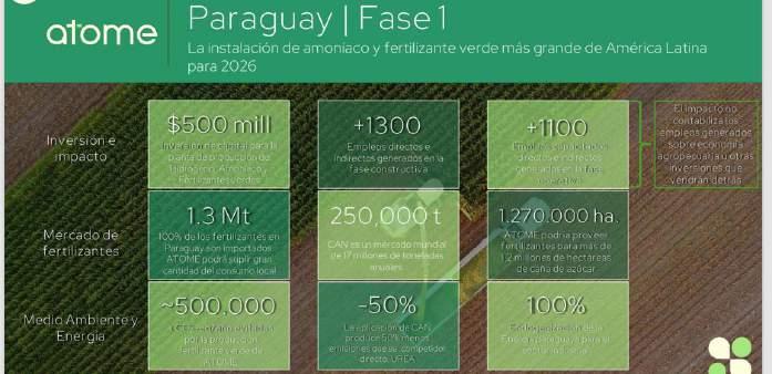 Se ha confirmado la finalización del diseño de ingeniería de la firma Atome, lo que permitirá iniciar a finales de este año la construcción de una planta de fertilizantes ecológicos en la ciudad de Villeta. La inversión estimada para este proyecto es de US$ 500 millones, y se prevé que la