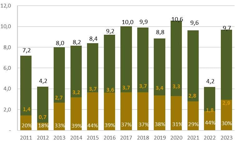 determinado en mayor parte por los envíos de habas de soja y arroz. Los mayores volúmenes exportados (27,8%), comparado con el año anterior caracterizado por una fuerte sequía, se vieron contrarrestados por una fuerte caída en los precios.