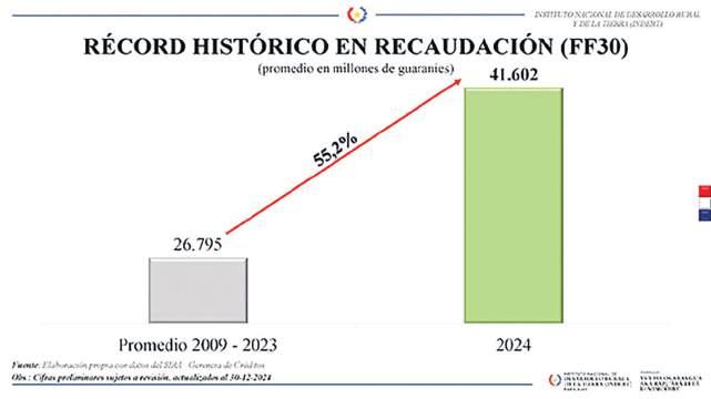 El Instituto Nacional de Desarrollo Rural y de la Tierra (INDERT) registró un ingreso de 41.602 millones de guaraníes en concepto de cuotas por lotes, pagados por los beneficiarios de la reforma agraria, en el año 2024. Este monto representa un aumento del 55,2% en comparación al promedio histórico de ingresos registrados del 2009 al 2023, que es de 26.795 millones de guaraníes.