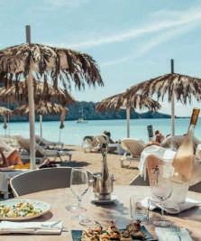EL DATO METROS DE LARGO TIENE LA PLAYA. 200 LA CIFRA moda, no está tan masi ficada como otras playas más cercanas a Ibiza ciu Aunquedad. cuenta con zo nas de arena en los beach clubs, Cala Jondal es de las pocas playas con pie dras redondas pulidas por el mar. No obstante, una vez en el agua su fondo es de fina arena. Son de un intenso tur quesa cristalino, siempre limpio, transparente y a una temperatura de lo más agradable. Por ende, es perfecta para practi car buceo. Es poco pro funda, así que también es ideal para familias. A pesar de ser una cala pequeña, su estatus de glamour no pasa por alto los servicios. Cuenta con zonas de hamacas y sombrillas privadas regentadas por los res taurantes -con tarifas no aptas para todos los bol sillos- así como personas que realizan masajes y puestos de venta de dife rentes Disponeartículos.debaños y duchas, accesos para personas con movilidad reducida y socorristas. Además, hay varias pa sarelas que comunican la orilla con el mar. Por sus condiciones sub marinas y morfológicas, en Cala Jondal proliferan los espectaculares yates balanceándose sobre sus apacibles aguas. Por este motivo, es habitual avis tar famoseo de alto stan ding en esta playa, ya sea a lo lejos en sus embar caciones o bien degus tando la comida en los exquisitos restaurantes que en ella se emplazan. Tropicana es uno de los restaurantes más famo sos de la isla. Es sofisti cado, con ambiente tran quilo y se encuentra en un espacio inmejorable. Sirven auténtica cocina mediterránea y sabro sos cócteles, con música chill out de fondo. No obstante, se transforma en un paraíso tropical con sus 'Tropical Nigths' en las que organizan bai les latinos. Puedes sabo rear su comida en su te rraza, en sus tumbonas o bien pedirla para que te la entreguen en tu yate mediante una lancha.