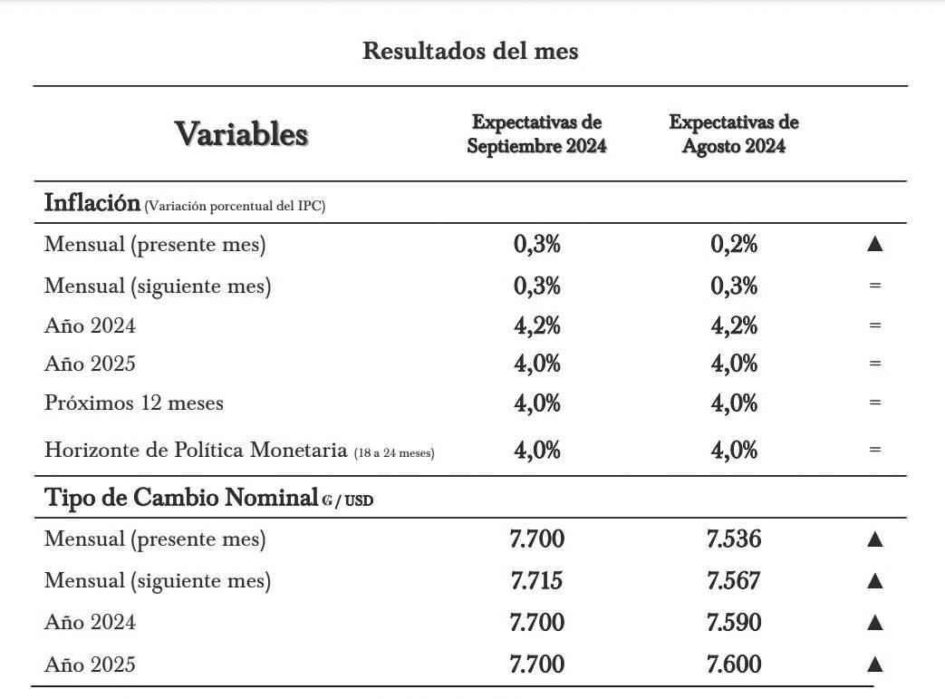 cuesta reflejan una visión positiva de los agentes económicos, que proyectan estabilidad en las variables clave como la inflación, el tipo de cambio y el crecimiento económico, junto con un ajuste a la baja de la tasa de política monetaria para el próximo año. Este escenario pinta un panorama de estabilidad y crecimiento moderado para la economía paraguaya en el corto y mediano plazo.