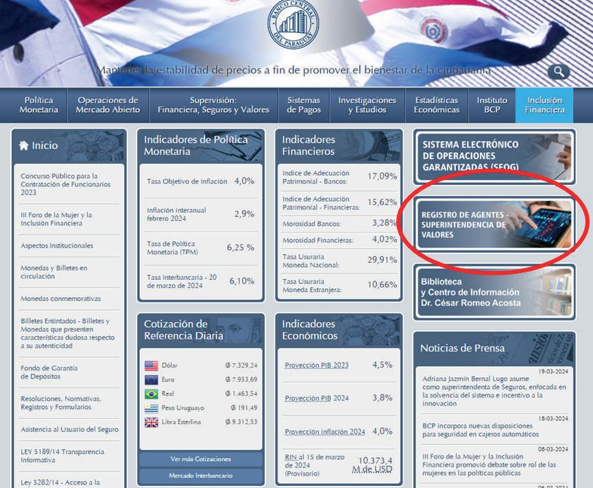 El Banco Central del Paraguay (BCP) habilitó la Herramienta de Registro de Agentes (HRA), una plataforma digital administrada por la Superintendencia de Valores (SV), diseñada para el registro de asesores bursátiles, operadores de mercado de valores y/o derivados, Sociedades Anónimas Emisoras (SAE) y Sociedades Anónimas Emisoras de Capital Abierto (SAECA). Los interesados pueden presentar sus solicitudes y documentos de respaldo digitalmente a través de la plataforma.