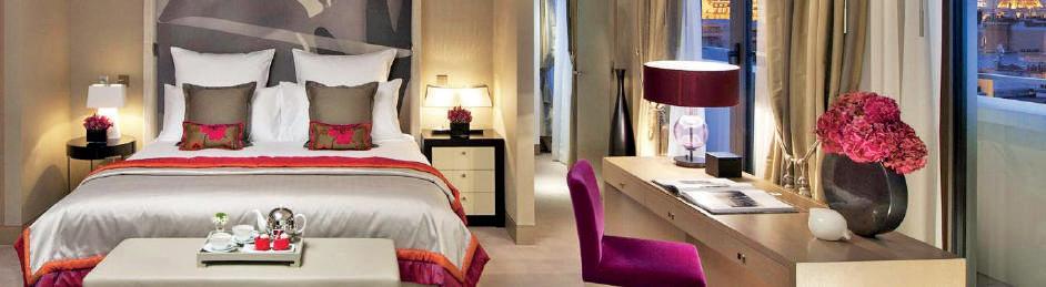 Mención especial merecen algunas de sus suites, con terraza y jardín privado, y en concreto, la suite panorámica y la suite penthouse, que son auténticos apartamentos de súper lujo desde los que se puede divisar la Torre Eiffel y prácticamente toda la ciudad.