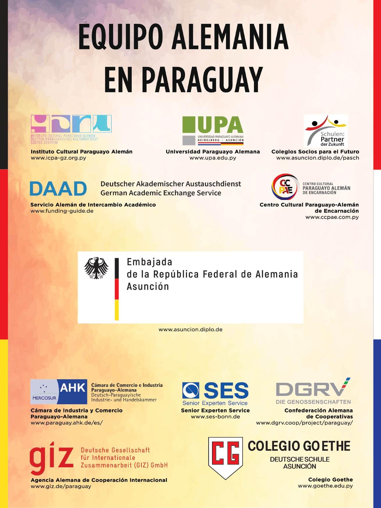 el sello de “excelente colegio alemán en el exterior”, contamos además con 14 colegios en Paraguay que tienen un enfoque en la enseñanza de alemán y que forman parte de la iniciativa PASCH, “Los colegios, socios para el futuro”. Esta iniciativa promueve la enseñanza calificada de alemán en el extranjero y despierta el interés por Alemania, su cultura e idioma. El ICPA, el Instituto Cultural Paraguayo-Alemán Goethe Zentrum ofrece excelentes cursos de alemán, pero también numerosos proyectos culturales creativos y apasionantes. De esta manera el ICPA se ha establecido como un actor indispensable en el panorama cultural en Asunción.