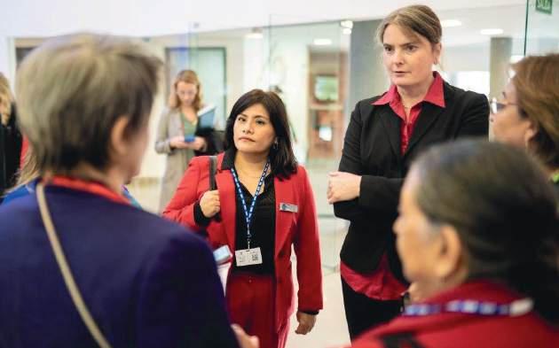 Izq.: Anette Walter durante el foro OEA - Der.: Anette Walter en una reunión con la viceministra de Relaciones Económicas e Integración.