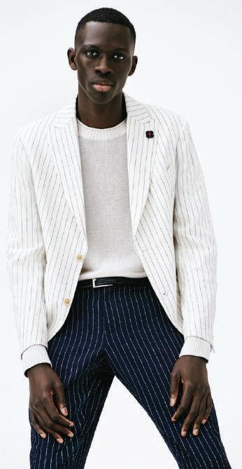 Los blazers sin forro y los pantalones a juego se han hecho con la tecnología TH Flex, en tejidos ligeros y naturales, unas telas que muestran singulares tipos de rayas, desde la clásica diplomática hasta las rayas 3D en contraste u otras de efecto óptico en denim.