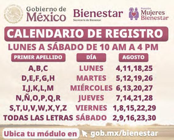 Y para ubicar los módulos respectivos, podrá ser consultada la página oficial: https:// ubicatumodulo.bienestar.gob. mx/, donde también se podrá revisar el día de registro conforme al primer apellido de la persona, de las 10:00 a las 16:00 horas, de lunes a sábado. Este es: lunes de letras del primer apellido A. B, C; martes de la letra D, E, F, G, H; miércoles letra de la I, J, K, L, M; jueves de la N, Ñ, O, P, Q, R; viernes de la S, T, U, V, W, X, Y Z; y el sábado podrán acudir de todas las letras. “Nos sentimos muy contentos de que inicie este programa, en reconocimiento a las muje-