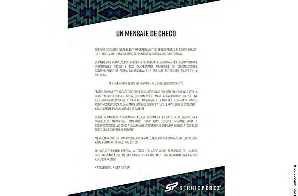 “Quiero agradecer a Checo todo lo que ha hecho por Oracle Red Bull Racing durante las últimas cuatro temporadas.