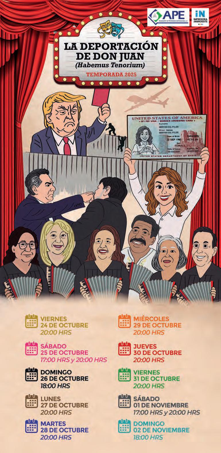La ciudad de Ensenada será asaltada de nueva cuenta por presuntos actores y “tundeteclas” que se preparan para presentar la temporada del Tenorio 2025, sátira cómico-política y dizque musical y además fusilada de la obra del inmortal José Zorrilla “Don Juan Tenorio”. En esta “broma de teatro” se abordarán los temas más relevantes -también los más intranscendentes- de la vida pública de Ensenada, el Estado, México y otros lugares del planeta. En esta ocasión el nombre de la “masacre”, perdón, del montaje, será “La Deportación de Don Juan (Habemus Tenorio)”, quienes presentarán por diez días consecutivos esta obra ya tradicional y esperada en la ciudad. La puesta en escena se realizará del 24 de octubre al 02 de noviembre en el Teatro Universitario y de los Periodistas Benito Juárez, a las 20:00 horas (de lunes a viernes), sábado doble función (17:00 y 20:00 horas) y domingos a las