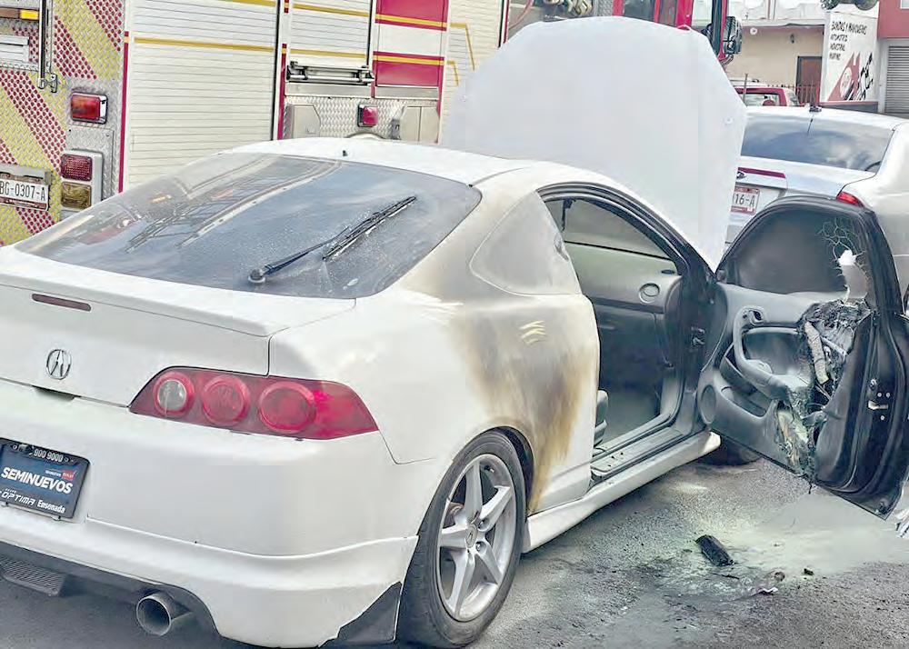un sedán implicado en la colisión, marca Renault Kwid color azul, reciente modelo, con placas de Baja California, utilizado para en transporte priva-