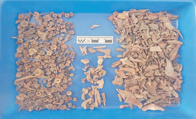erizos de mar, vértebras, espinas y otras partes óseas de peces de distintas especies, diferentes huesos de la anatomía esquelética de pinnípedos (lobos marinos y probablemente focas) y nutrias, y en ocasiones hasta fragmentos de cetáceos (ballenas).