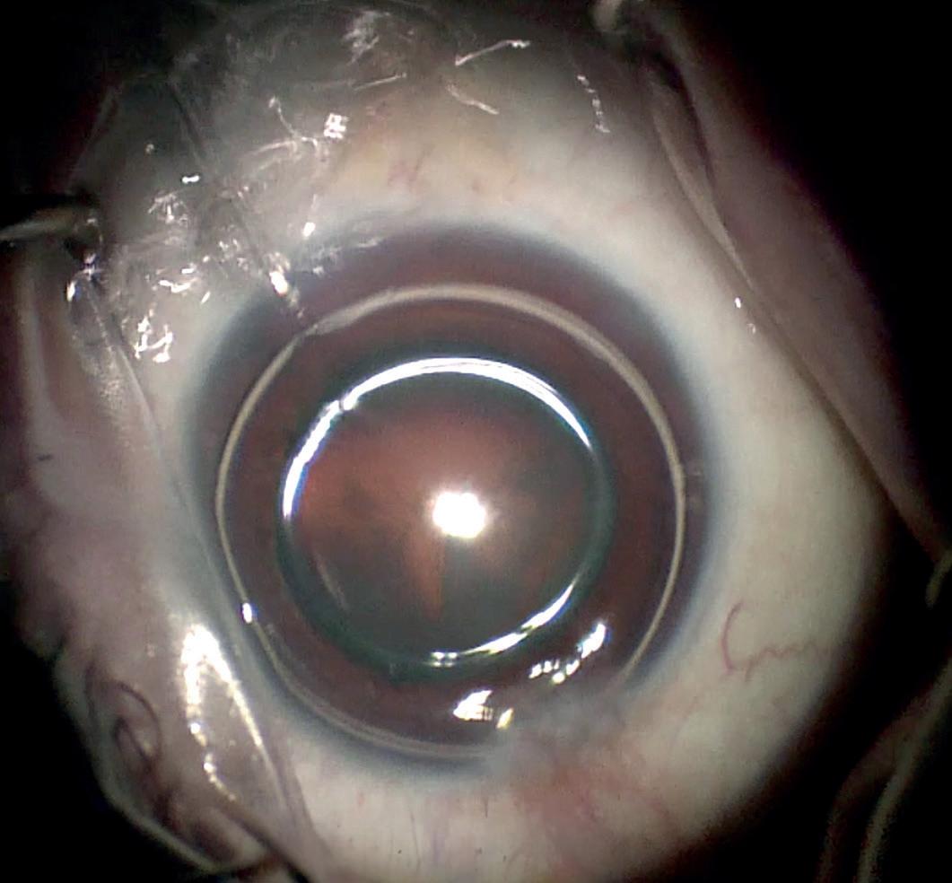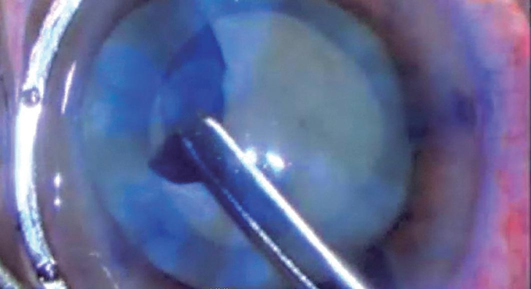Figura 2-9. Capsulorrexis, empleando tinción capsular con la técnica “aire azul, aire”, perfectamente visible.