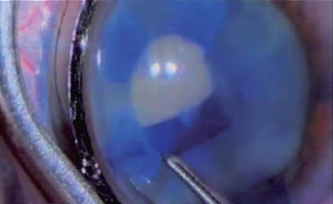 En presencia de una catarata que por su densidad impida la presencia de reflejo retiniano, como podemos encontrar en el caso de una catarata blanca (por hidratación de la cor teza)1-2 o ante una catarata muy dura (brunescente, rubra, negra),3 puede ser difícil la creación de una capsulorrexis anterior continua porque el borde de la misma se pierde fácilmente de nuestro control visual y podría correrse ha cia la periferia. Es por ello que se han estudiados diferentes colorantes (azul de tripano, verde de indocianina [ICG], flouresceína), evaluando su eficacia para teñir la cápsula y su potencial toxicidad.