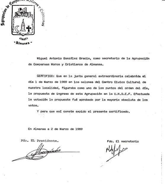En el primer fin de semana del mes de Marzo, se celebrará la Asamblea General de UNDEF, que este año tiene como sede la población alicantina de El Campello, (cuando usted lea este artículo ya se habrá celebrado), y para la Agrupación de Comparsas tiene una gran importancia ya que ésta significará el pistoletazo de salida para la que tendrá lugar en 2019 y cuya sede será nuestra ciudad. En El Campello se presentará oficialmente a la ciudad de Almansa y a su Agrupación de Comparsas de Moros y Cristianos como los organizadores de la Asamblea General Ordinaria y Extraordinaria de la UNDEF, así como de los actos a celebrar ese fin de semana. Así, en el año 2019 no solo celebramos el 40 aniversario de la Agrupación de Comparsas, sino también el 30 aniversario de nuestra incorporación a Undef.