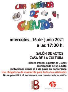 Sesión de narración oral para público infantil a partir de 3 años acompañado de un adulto. Fecha: miércoles 16 de junio, a las 17:30 h. Lugar: salón de actos de la Casa de la Cultura. Invitaciones: disponibles, a partir del 7 de junio en la consejería de la Casa de la Cultura. Uso obligatorio de mascarilla para todos los asistentes