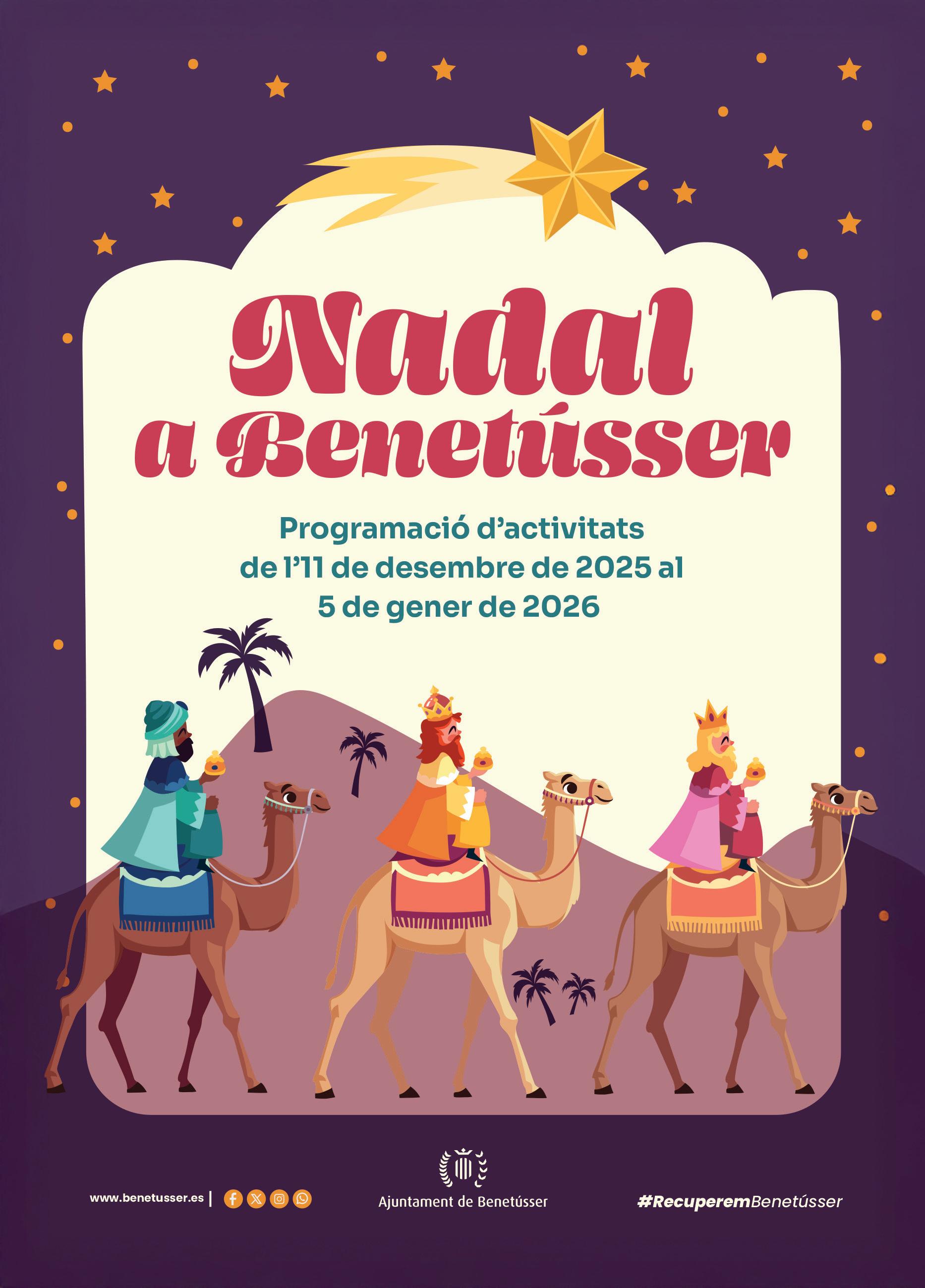 Tallers de manualitats, Sant Silvestre solidària, homenatge als nostres majors de més de 90 anys, concerts i danses nadalenques, fira de Nadal, contacontes, espectacles musicals i moltes altres activitats protagonitzaran les pròximes setmanes. I tampoc ens oblidarem de la màgia, amb les visites de Pare Noel, dels patges reials i dels mateixos Reis d’Orient que, com sempre, visitaran Benetússer per portar regals i il·lusió als nostres xiquets i xiquetes.
