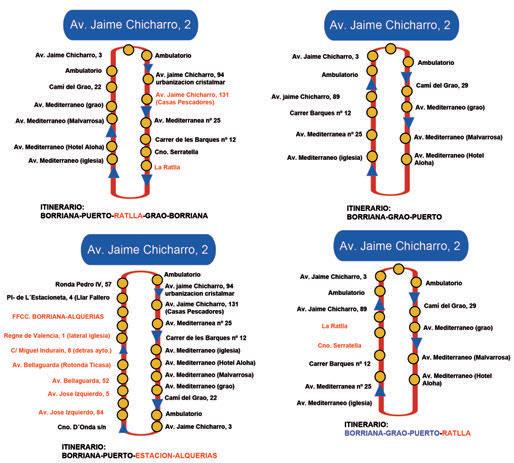 BORRIANA·ALQUERIES SANTA BÀRBARA 7.30 11.30 NOMÉSDIMARTSDIADEMERCAT HORARIS: BORRIANA·RENFE·ALQUERIES 10.20 ALQUERIES·RENFE 12.20 ALQUERIES·RENFE 15.20 ALQUERIES·RENFE 19.20 ALQUERIES·RENFE HORARIS FINS A LA RATLLA 8.20 11.20 18.20 20.20