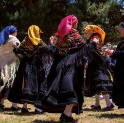 Carros - Pendones - Mujeres con arcos de flores y vestimenta tradicionalRomeros - Dulzaineros - Danzantes Pañuelo tradicional en la Plaza Mayor