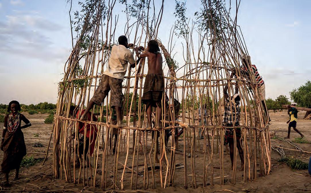 Las sociedades seminómadas de cazadores recolectores del valle del Rift, que actualmente habitan una sabana en la que perviven hienas y leones, se sirven tanto de cabañas como de hogueras para conjurar los peligros de la noche. Los hadza —fracción relicta de la etnia khoisan, atesoran el ADN mitocondrial más antiguo de entre los humanos vivos— construyen sus refugios no lejos de Olduvai y de Kalambo. Los de mayores dimensiones acostumbran a contener un hogar en su interior y los menores lo tienen habitualmente frente a la entrada. En cualquier caso, una estructura principal de ramas sostiene una cobertura vegetal que resulta de apilar hojas con sus tallos, de trenzar el follaje o de superponer parches de tejidos vegetales. La materia prima no difiere, pues, de la utilizada por los grandes simios para construir sus nidos y herra-