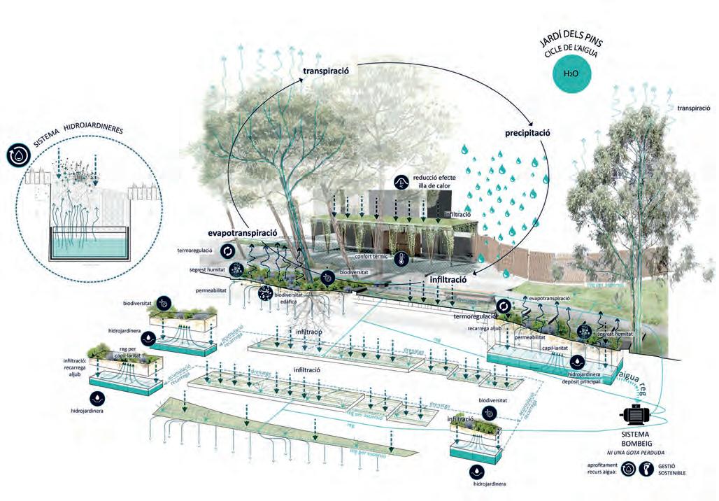 EP Podríamos hablar de la Alhambra desde muchos puntos de vista, también como un sistema ambiental. Pero, antes de nada, es necesario recordar que los palacios de la Alhambra son, en lo fundamental, espacios concebidos para el verano. De ahí la importancia, en primer lugar, de la red hidráulica como sistema para refrescar, un sistema que comienza en el territorio, no en el edificio. El entorno de la Alhambra carecía de manantiales y, debido a la topografía abrupta, el acceso al agua del río resultaba, por otro lado, imposible, de modo que el aprovisionamiento se hizo depender a priori de aljibes de agua de lluvia. Pero pronto fueron conscientes de que el agua así captada resultaba insuficiente para lo que la Alhambra debía ser —una ciudad palatina más que un edificio—, por lo que se decidió, sin escatimar costes, tomar el agua del río Darro aguas arriba, a unos diez kilómetros de distancia, y conducirla a través de una compleja red de acequias que bajaba serpenteando con una pendiente muy suave. Esa red abastecía palacios, baños, edificios, jardines, cisternas y fuentes, y finalmente se derramaba por las laderas de la colina, donde servía también a algunos barrios popu-