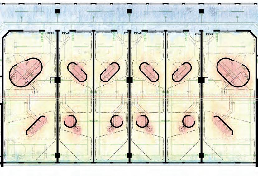 JT Lo más relevante, sin embargo, es que cuestiona el modelo homotérmico tradicional de un interior estable a 21 °C, que requeriría una fachada aislada y hermética con un sistema de calefacción bajo las ventanas para compensar las pérdidas y distribuir el calor por convección en todo el espacio. En su lugar, se ensaya un modelo heterotérmico en el que los focos de calor ya no se sitúan en la envolvente, sino en el centro de la vivienda: el baño y kitchenette asumen este papel como cápsulas emisoras. Construidos en acero inoxidable, incorporan tabiques con circuitos radiantes de agua revestidos con morteros de arcilla que aportan inercia térmica e irradian calor al activarse. Estos núcleos, que evocan la hoguera como centro doméstico, generan gradientes de temperatura: el ambiente se percibe más cálido cuanto más cerca se está de ellos. Para limitar pérdidas, se recurre a un sistema de cortinas móviles confeccionadas con un tejido acrílico recubierto de aluminio que actúa como aislamiento reflexivo: contiene la radiación, compartimenta el espacio y permite crear zonas diferenciadas de temperatura. El resultado es un paisaje térmico variable que invita a los residentes a habitar de manera activa, eligiendo situarse en zonas más cálidas o más frescas según la estación y la actividad. En las unidades privadas, los núcleos húmedos concentran la emisión de calor, mientras que los espacios compartidos del cluster —la cocina colectiva y la pasarela— permanecen simplemente atemperados, y actúan como colchones térmicos. De este modo, la estrategia devuelve protagonismo al calor radiante, capaz de estructurar la vida doméstica mediante gradientes en lugar de uniformidades.