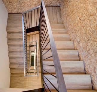 de la trama estructural con la irregularidad orgánica, por la presencia o sustracción de los módulos. En el interior solo hay las divisiones imprescindibles, casi todas resueltas con vidrio. El suelo y el techo son continuos, de un solo material. Ese cerramiento de mayor grosor tiene la ventaja añadida de la eficiencia energética, y junto a otros medios, ha permitido conseguir una clasificación A. La fachada es multicapa, con la mencionada envolvente exterior de lamas que protege del impacto solar directo y muestra la cara amable de la madera. Luego viene una manta continua de lana mineral hidrófuga con velo negro, que pasa por delante de cantos de forjado, petos y techos de porches, hasta contactar con las carpinterías y la cubierta. Todo está soportado por un muro de fábrica por delante de la estructura, enfoscado con mortero hidrófugo y proyectado de poliuretano al interior. Permite sujetar el rastrelado de fachada y el trasdosado de cartón-yeso con lana mineral. Cada una de estas cinco capas asegura y refuerza una función diferente, desde la continuidad formal, hasta el aislamiento, pasando por la materialidad y el control lumínico.