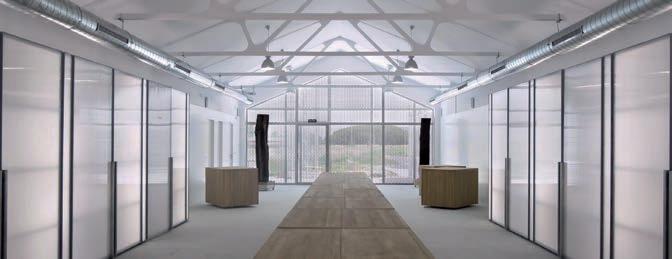 fica, ejercía como apertura del interior hacia el exterior ya que una vez abierto en su totalidad dejaba al descubierto la nave expositiva; integrando la sección en el paisaje pero también el exterior en el interior. Los acabados de lo que fue sala de despiece, también resueltos en blanco, se interrumpen por una seriación de armarios realizados en tubo de acero y policarbonato para alojar los utensilios a emplear en el oficio de la resinación. Intersticialmente, y de manera rítmica, se dispusieron las luminarias en su interior. Los armarios no solo debían ejercer funciones propias a su naturaleza, sino que se diseñaron como “velo iluminador”. Su ubicación, tras las láminas traslúcidas y opales del policarbonato, facilitó una iluminación densa, indirecta; dotando al recinto de una necesaria atmósfera solemne, conforme a su carácter expositivo, pero ejecutada con recursos económicos muy limitados. El mobiliario, también se diseñó para participar del carácter poli-