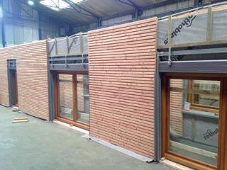 Las lamas son perfiles huecos de 45x45 mm, compuestos de madera y PVC al 50%, ligeramente raspados para mejorar su aspecto fibroso. Tienen tapones, el inferior perforado para evitar condensaciones interiores. Este nuevo material busca mantener la grata percepción de las texturas naturales como la madera, pero añadiendo durabilidad mediante la mezcla con plásticos. Su carácter innovador y tecnológico contrasta con la colocación mediante un detalle deliberadamente sencillo y directo. En el muro de fábrica se sujetan unos jabalcones sobre los que van colocados rastreles horizontales cada 120 cm aproximadamente, todo ello resuelto con tubo de acero galvanizado 80.50.2 que asegura una mayor durabilidad y se puede colocar sin soldaduras, mediante tornillos que permitan su dilatación. Sobre esos rastreles se atornillan por detrás las lamas verticales, sujetas con una L de acero galvanizado, avellanada para permitir la fuerte dilatación de este material, de casi 1 mm por cada metro de longitud. Su separación es variable, para evitar que coincidan verticalmente. Así cada paño tiene una trama ligeramente distinta. Las lamas forman bandas horizontales