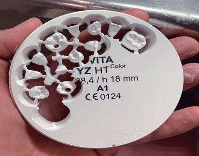 Fig. 2: Las restauraciones fresadas en la pieza en bruto, inmediatamente después de la fabricación asistida por ordenador.